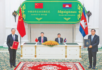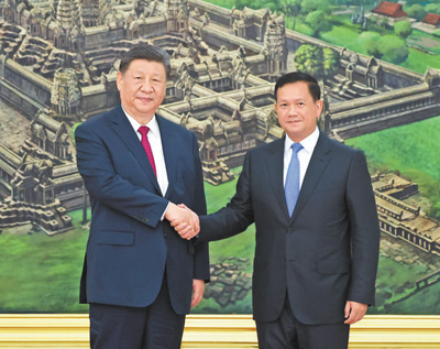 本報(bào)金邊4月17日電 (記者李婕、白元琪)4月17日晚,國(guó)家主席習(xí)近平同柬埔寨首相洪瑪奈在金邊和平大廈舉行會(huì)談。兩國(guó)領(lǐng)導(dǎo)人一致同意攜手構(gòu)建新時(shí)代全天候中柬命運(yùn)共同體,宣布2025年為“中柬旅游年”。