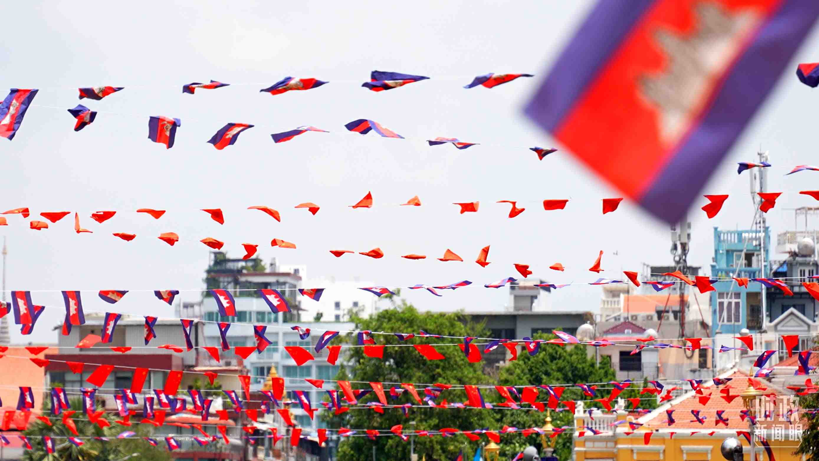 △金邊街頭懸掛的中柬兩國(guó)國(guó)旗。(總臺(tái)央視記者盧心雨拍攝)