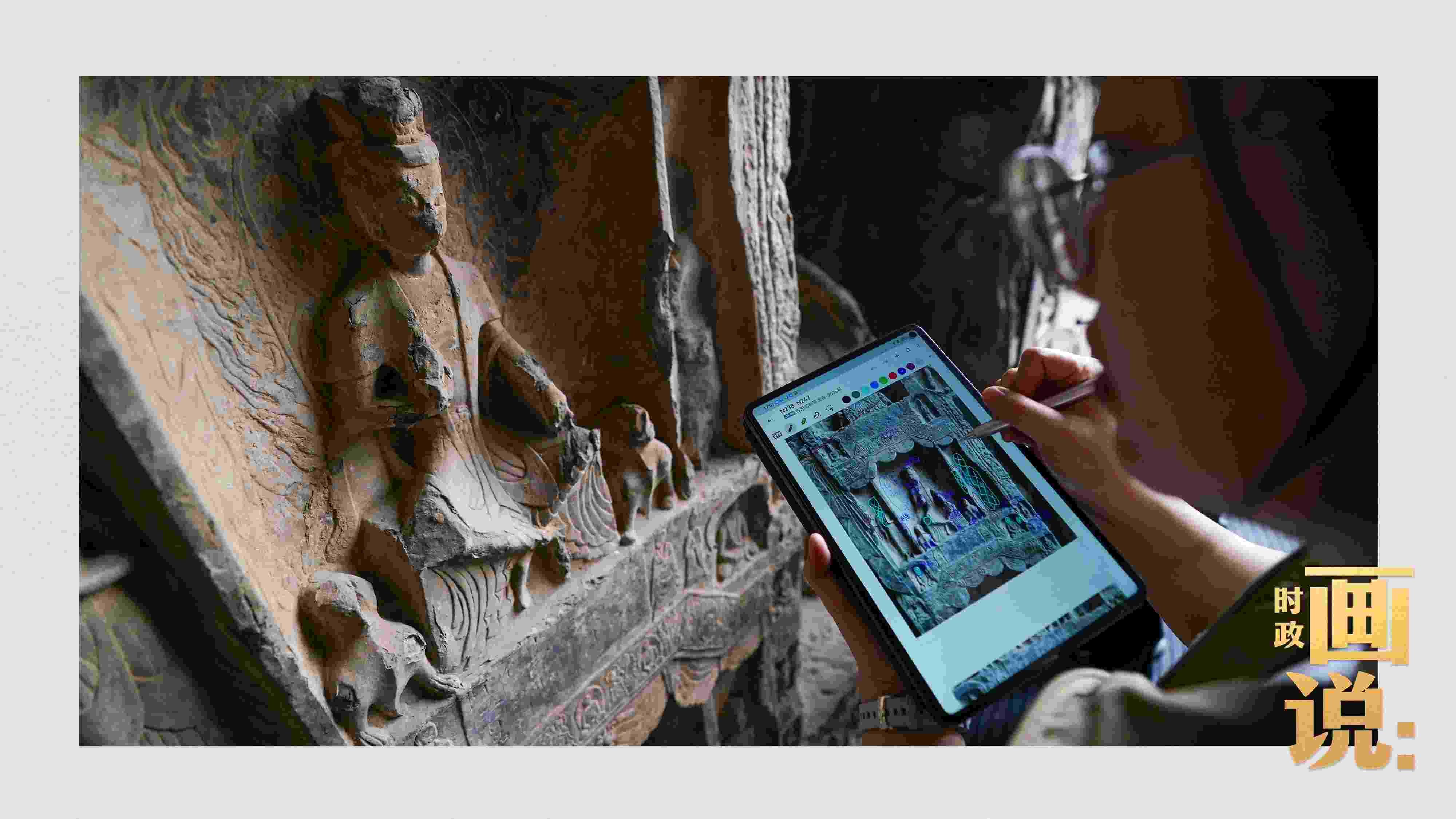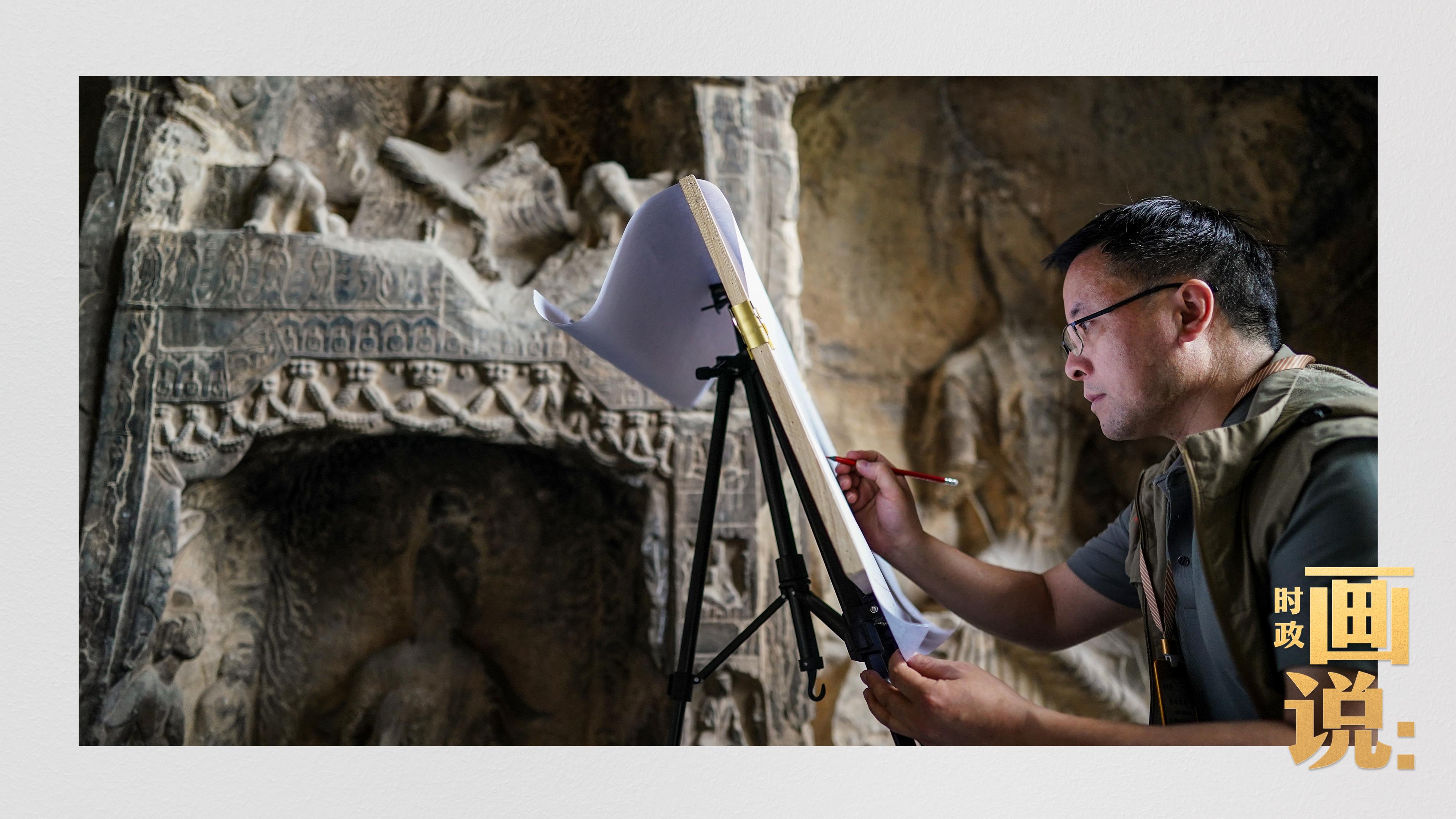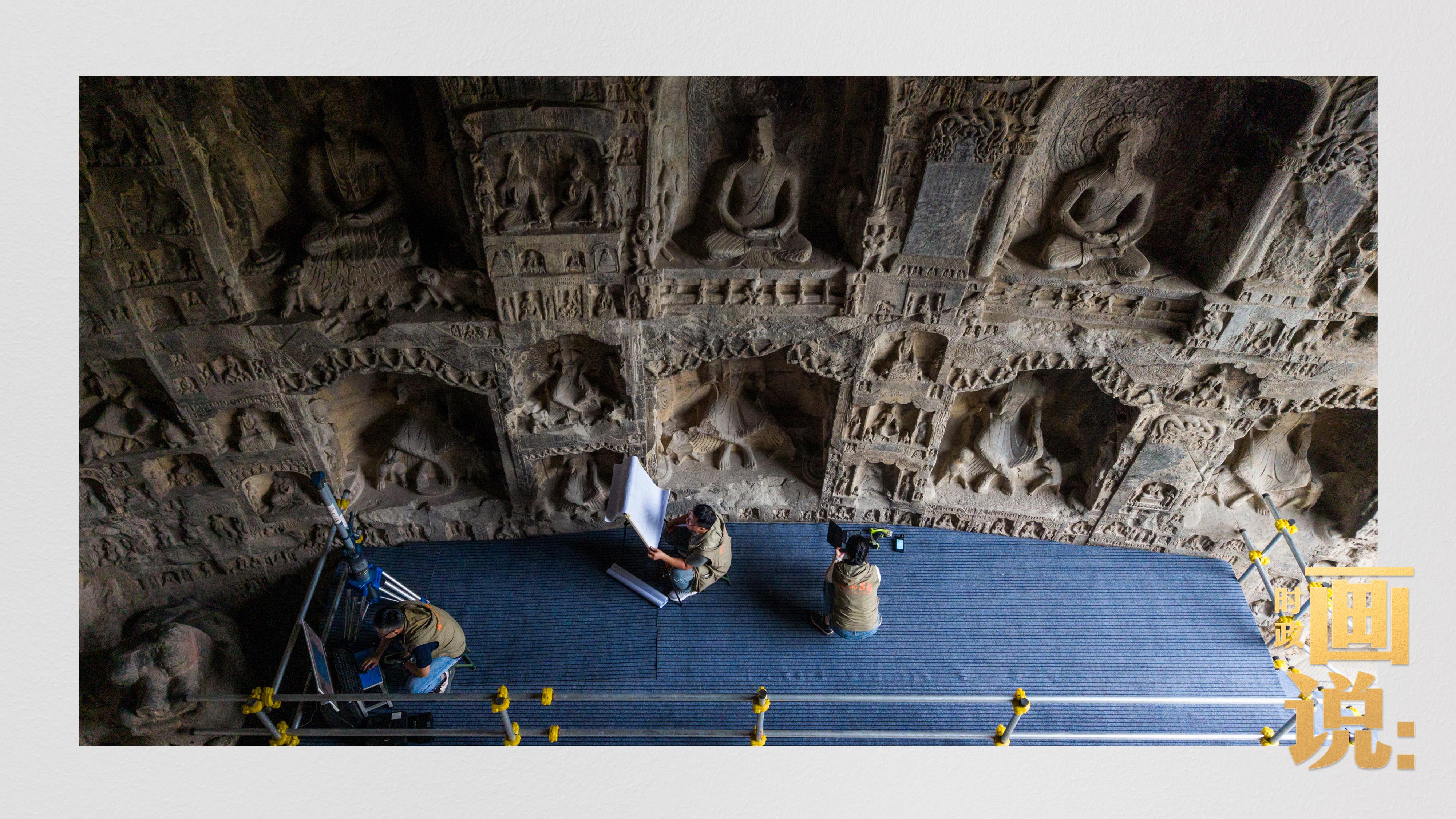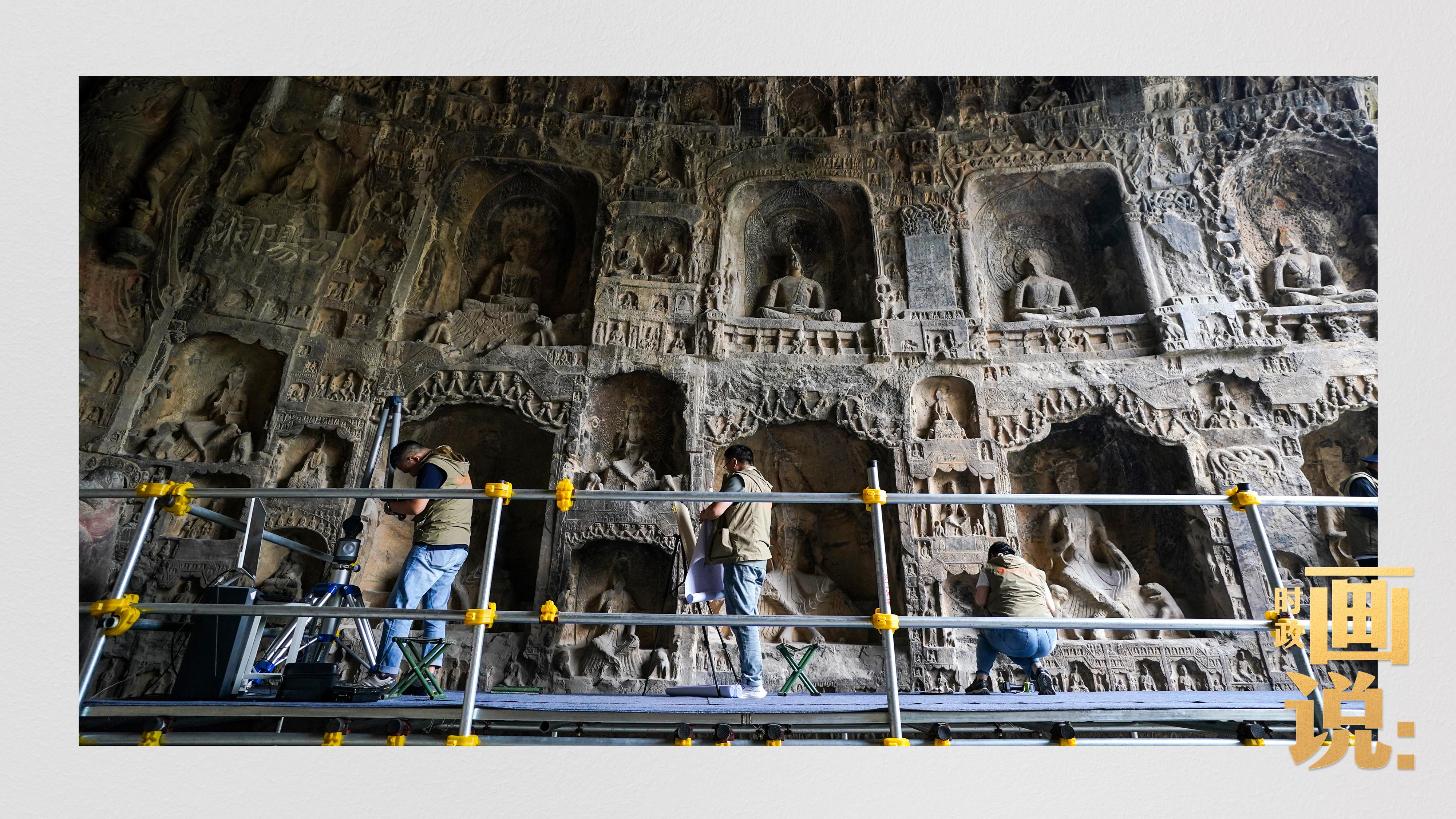 △龍門石窟研究院工作人員在古陽洞使用關節(jié)臂掃描儀對佛像進行數(shù)字化掃描
