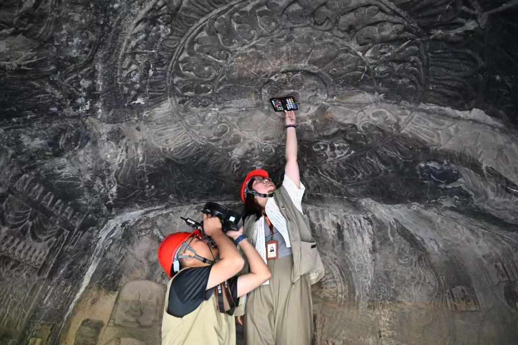 4月10日,龍門石窟研究院工作人員(右)與武漢大學(xué)文化遺產(chǎn)智能計(jì)算實(shí)驗(yàn)室團(tuán)隊(duì)成員一同對龍門石窟魏字洞進(jìn)行高清攝影掃描。新華社記者 李嘉南 攝
