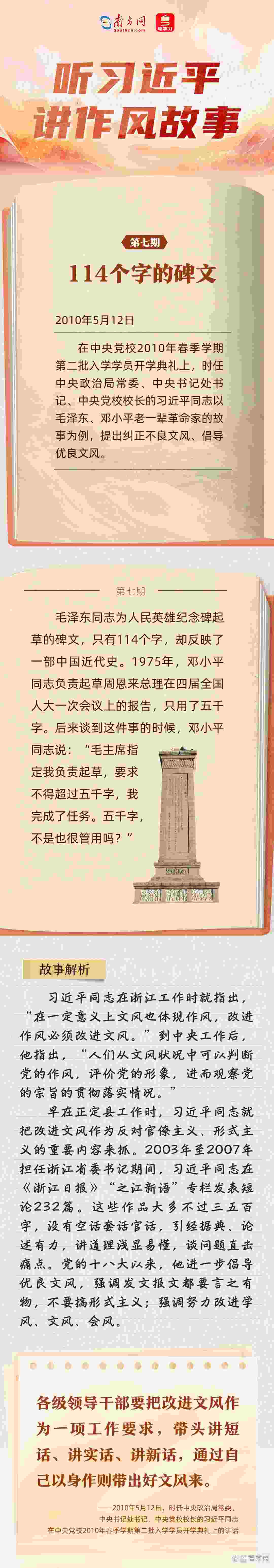當(dāng)前,全黨上下正在開展深入貫徹中央八項(xiàng)規(guī)定精神學(xué)習(xí)教育,縱深推進(jìn)作風(fēng)建設(shè)。關(guān)于作風(fēng)建設(shè),習(xí)近平總書記常用講故事的方式,傳達(dá)深意、感染他人,給人以思想啟迪。南方網(wǎng)、粵學(xué)習(xí)客戶端推出“聽習(xí)近平講作風(fēng)故事”系列報(bào)道,與您一起感悟這些故事蘊(yùn)含的深刻道理。 今天,推出《聽習(xí)近平講作風(fēng)故事⑦丨114個(gè)字的碑文》,與您一起學(xué)習(xí)毛澤東、鄧小平老一輩革命家的文風(fēng)。