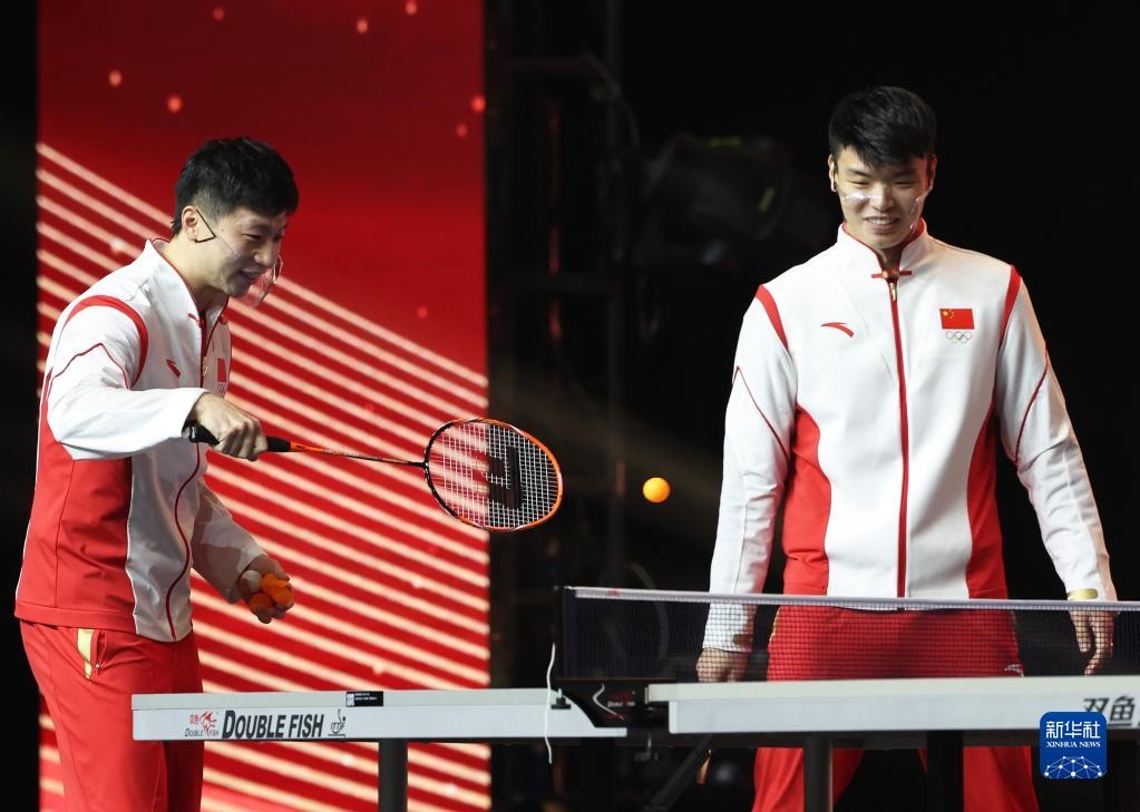 12月20日,內(nèi)地奧運(yùn)健兒代表團(tuán)成員馬龍(左)與王懿律在活動中參與游戲。