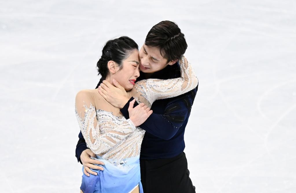 2月19日,中國選手隋文靜(左)/韓聰在2022年冬奧會花樣滑冰雙人滑比賽奪冠后。新華社記者李一博攝