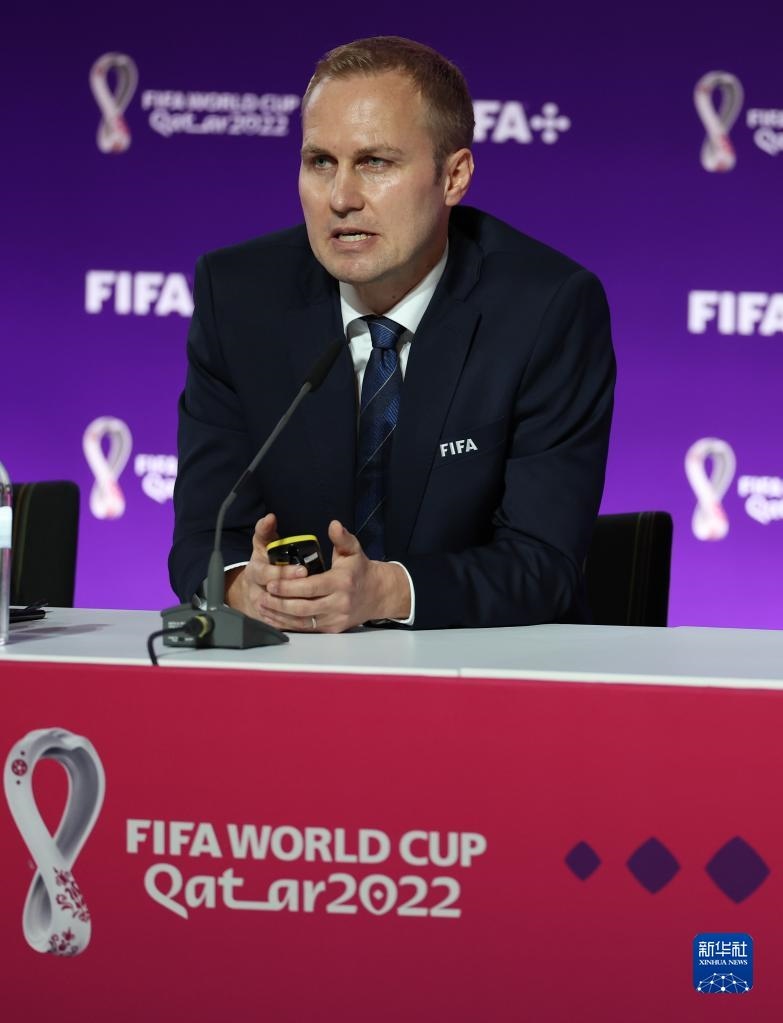 11月18日,國際足聯(lián)足球技術與創(chuàng)新總監(jiān)霍爾茲穆勒在通氣會上介紹半自動越位識別技術。新華社記者 賈浩成 攝