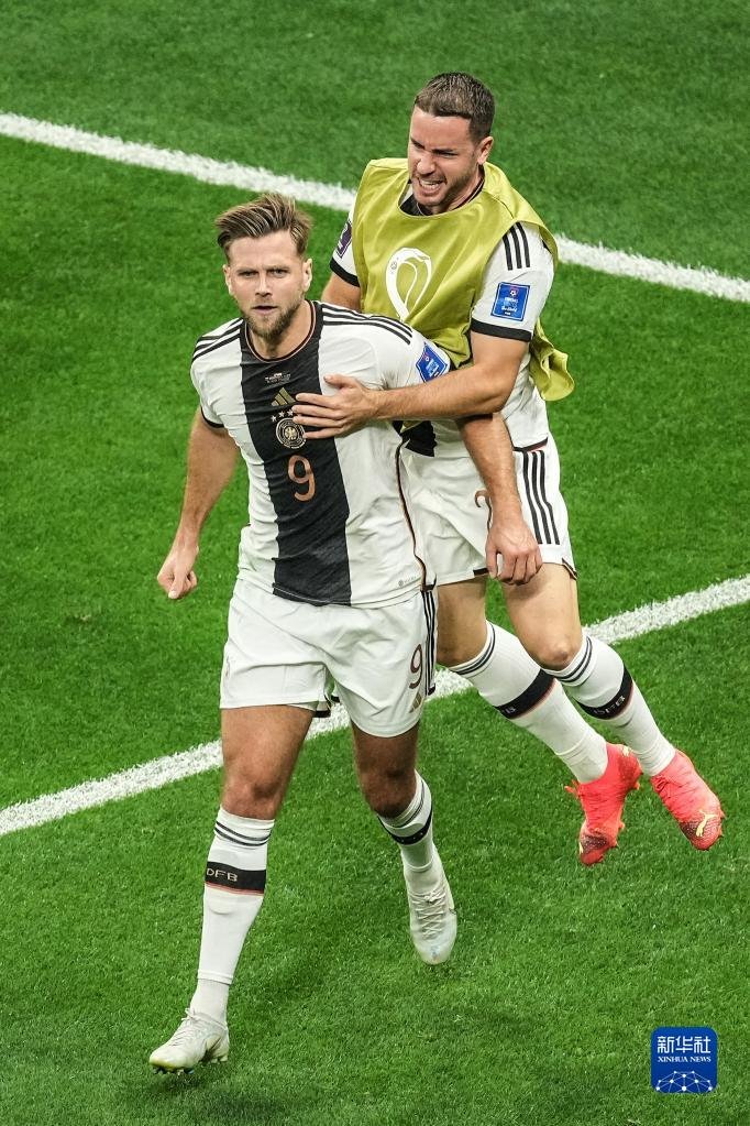 11月27日,德國隊球員尼克拉斯·菲爾克魯格(左)在比賽中進球后與隊友慶祝。新華社記者 潘昱龍 攝