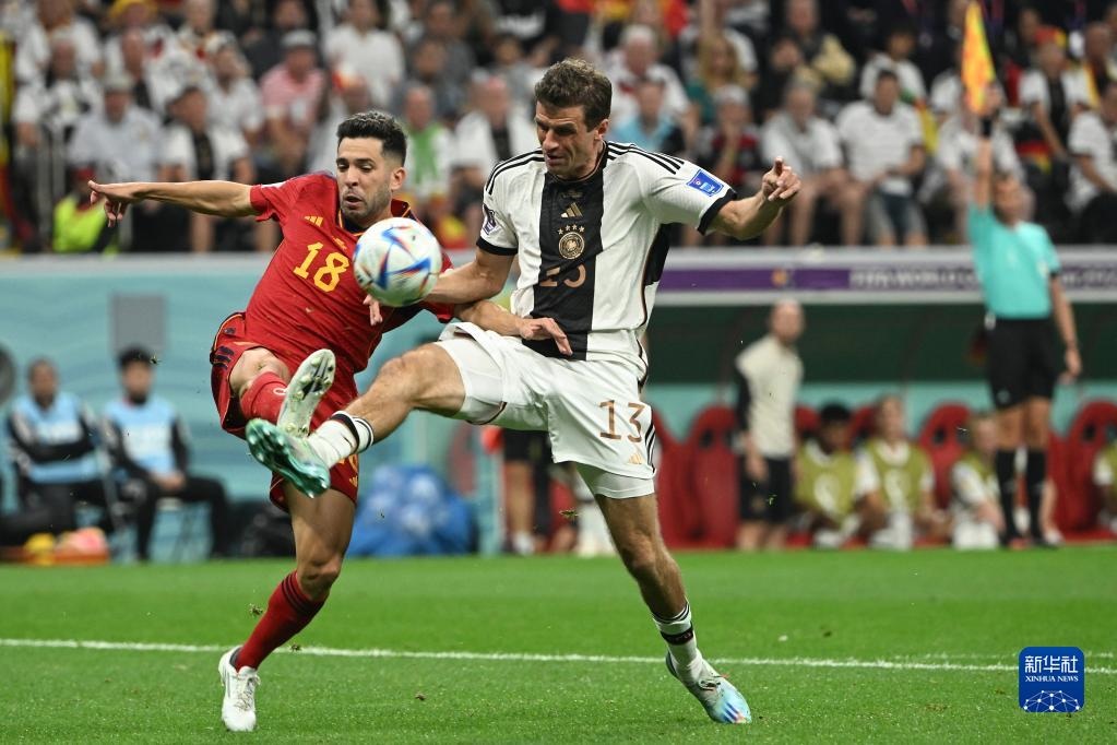 11月27日,西班牙隊球員阿爾巴(左)與德國隊球員托馬斯·穆勒在比賽中拼搶。新華社記者 李尕 攝