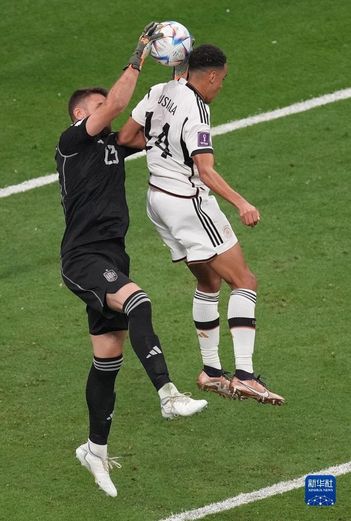 11月27日,德國隊球員賈邁勒·穆夏拉(右)與西班牙隊守門員烏奈·西蒙在比賽中拼搶。新華社記者 陳誠 攝