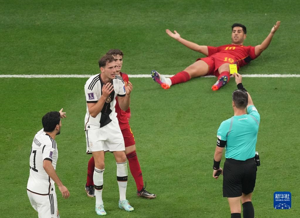 11月27日,主裁判在比賽中向德國隊球員萊昂·格雷茨卡(左二)出示黃牌。新華社記者 陳誠 攝