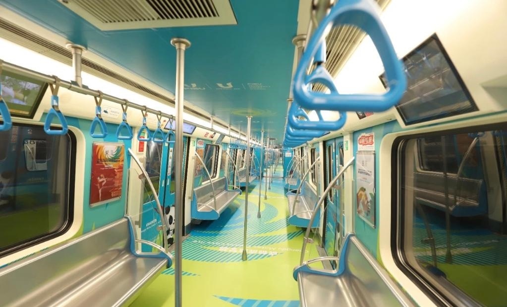 整體車廂打造創(chuàng)新植入了色彩明快、充滿青春氣息的“移動運動場”概念,立面畫面則結合青春動感的大學生形象,并選用田徑、網球、籃球、體操等運動的代表性動作為設計元素,全面凸顯成都大運會賽事核心主題。