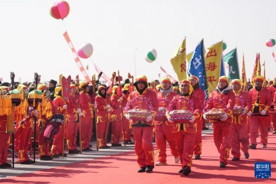 當(dāng)日,遼寧省盤錦市舉辦盤錦首屆漁雁文化節(jié)暨第六屆二界溝開海節(jié)?;顒又袧O家祭祀、非遺秧歌、舞獅等演出再現(xiàn)當(dāng)?shù)貪O雁文化,漁民也通過這樣的形式表達盼望新一年漁業(yè)豐收的美好愿望。
