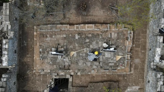 工人在箭扣長(zhǎng)城121號(hào)敵臺(tái)頂部進(jìn)行考古清理(4月30日攝,無(wú)人機(jī)照片)。目前,該敵臺(tái)已完成考古,進(jìn)入修繕施工階段。新華社記者 陳鐘昊 攝