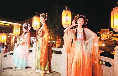 洛邑古城相關(guān)負(fù)責(zé)人介紹,景區(qū)致力于漢服文化的推廣與傳承,創(chuàng)意打造穿越新場(chǎng)景,豐富文旅新業(yè)態(tài)。景區(qū)有24個(gè)朝代的漢服形制、56個(gè)民族的服飾款式,游客可找到各自喜歡的款式,扮演喜愛(ài)的角色。燈獅畫(huà)橋、香羅幔天、文峰暮鼓等30余處場(chǎng)景,讓游客盡享“穿越自由”。洛邑古城還策劃了一系列創(chuàng)新主題活動(dòng),讓身著漢服的游客與“李白”“武則天”談古論今,與“嫦娥”“牡丹花神”近距離互動(dòng)。