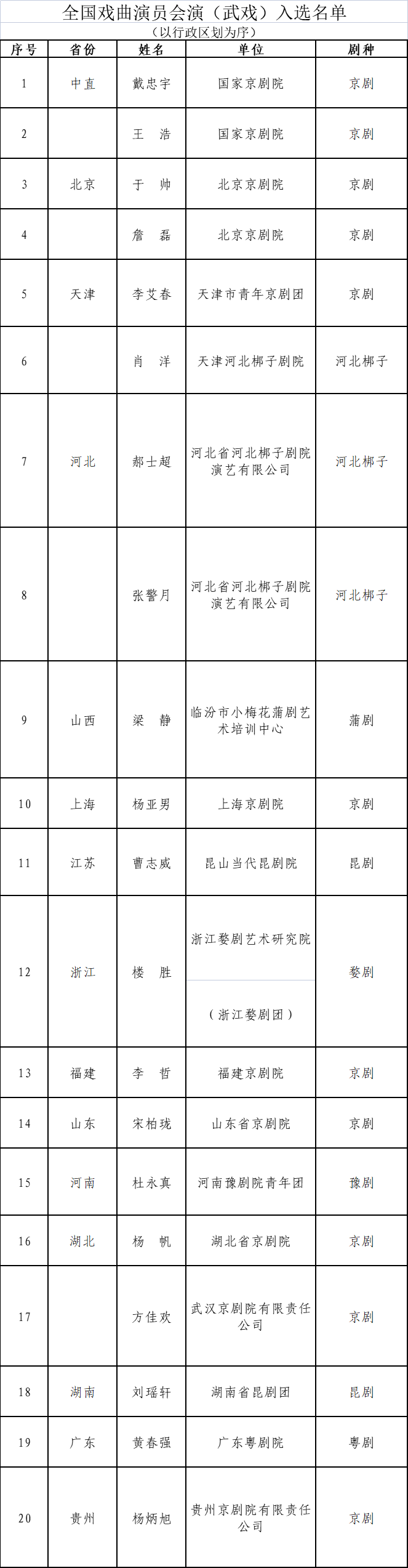 人民網(wǎng)北京3月25日電 (記者楊虞波羅)據(jù)文化和旅游部官網(wǎng)消息,日前,全國戲曲演員會(huì)演(武戲)遴選和公示工作已結(jié)束。現(xiàn)將入選名單予以公布,并就有關(guān)事項(xiàng)函告如下。
