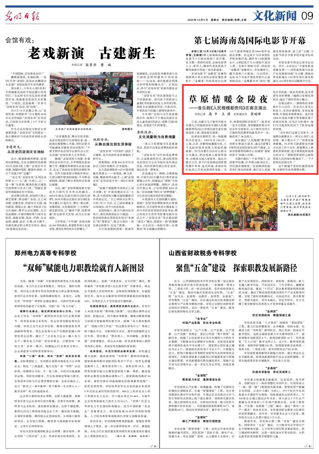 2025年12月5日《光明日報》第9版刊發(fā)了《原情暖金陵夜——音樂劇《人民楷模都貴瑪》在南京演出》的文章,報道了日前,內(nèi)蒙古烏蘭察布市察右后旗烏蘭牧騎原創(chuàng)音樂劇《人民楷模都貴瑪》在江蘇南京演藝星空劇場連續(xù)上演,現(xiàn)場座無虛席。這個跨越千里的民族團結(jié)故事,在新時代依然熠熠生輝。