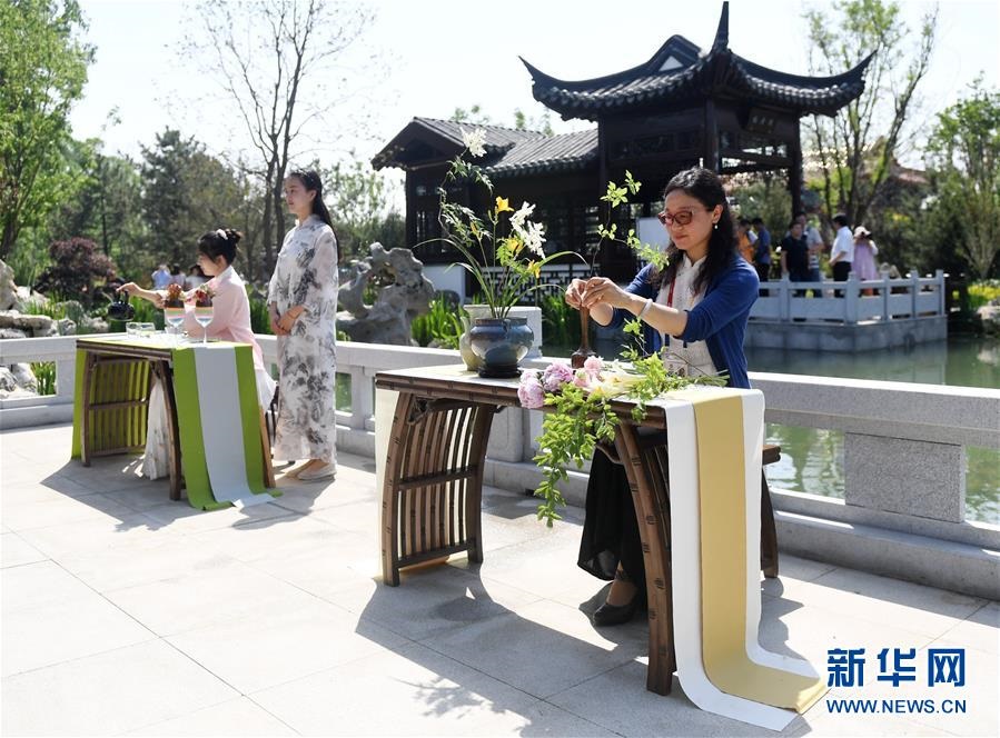 工作人員在北京世園會江蘇園內(nèi)展示插花技藝(6月2日攝)。