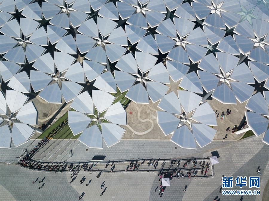 游客在北京世園會國際館前排隊參觀(10月7日無人機(jī)拍攝)。