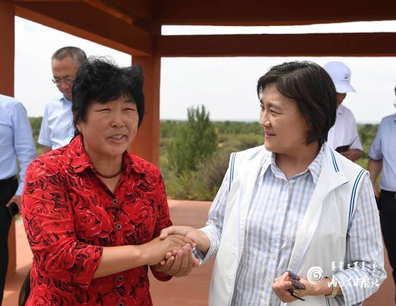 烏蘭陶勒蓋治沙站位于烏審旗毛烏素沙地腹部,建站40多年來,以治沙造林、保護(hù)森林資源為己任,一代接著一代干,防沙治沙工作取得了明顯成效。布小林來到烏蘭陶勒蓋治沙站,調(diào)研治沙造林工作,并與全國“三八·綠色獎(jiǎng)?wù)隆鲍@得者殷玉珍親切交流,對(duì)當(dāng)?shù)厣鷳B(tài)治理的模式和成效給予肯定。她還來到伊金霍洛旗紅慶河鎮(zhèn),考察鄉(xiāng)村治理、消費(fèi)扶貧等工作。