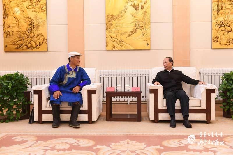 7月29日,自治區(qū)黨委書(shū)記、人大常委會(huì)主任石泰峰在主持召開(kāi)草原生態(tài)保護(hù)補(bǔ)助獎(jiǎng)勵(lì)政策實(shí)施情況專題匯報(bào)會(huì)前,會(huì)見(jiàn)自治區(qū)人大代表浩畢斯嘎拉圖。內(nèi)蒙古日?qǐng)?bào)記者袁永紅攝