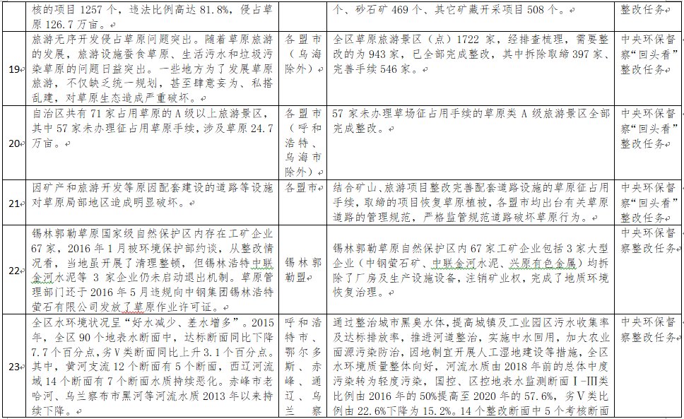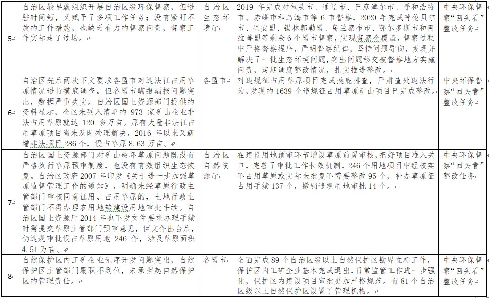 中央環(huán)境保護(hù)督察以來,自治區(qū)各級黨委政府及相關(guān)部門高度重視反饋意見整改工作,貫徹落實(shí)習(xí)近平生態(tài)文明思想的自覺性和主動性顯著增強(qiáng),采取強(qiáng)有力措施積極推動整改工作,整改工作取得階段性成果。近期部分整改任務(wù)已通過自治區(qū)相關(guān)委辦廳局驗(yàn)收,現(xiàn)予以公示,公示期2021年2月5日至2月9日,未提出異議的整改任務(wù)給予銷號(聯(lián)系電話:0471-4632171)。