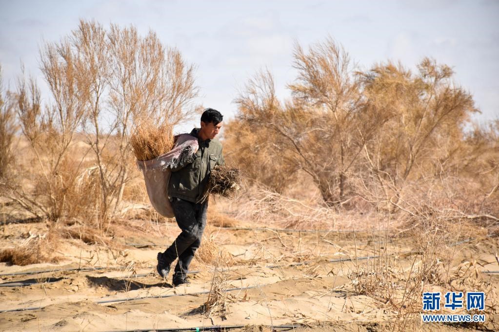 在且末縣,當(dāng)?shù)卦谥袊?guó)科學(xué)院新疆生態(tài)與地理研究所的技術(shù)支持下,嘗試種植梭梭和大蕓。梭梭耐鹽堿、耐干旱,能防風(fēng)固沙;寄生在梭梭根部的大蕓具有很高的藥用價(jià)值,能讓沙漠產(chǎn)出經(jīng)濟(jì)價(jià)值。通過“承包治理、開發(fā)經(jīng)營(yíng)、收益歸己”的招商原則,目前已吸引10家企業(yè)參與進(jìn)來,走出一條生態(tài)與經(jīng)濟(jì)同步發(fā)展的新路。