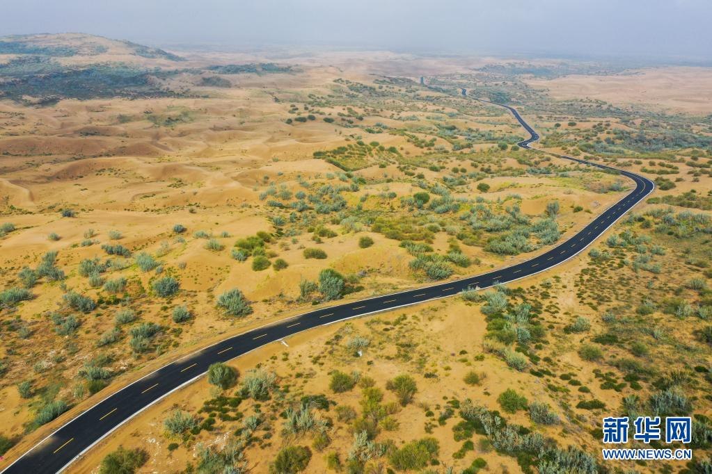 這是新疆且末縣國(guó)道旁種植的生態(tài)梭梭林(3月31日攝,無人機(jī)照片)。新華社記者 高晗 攝