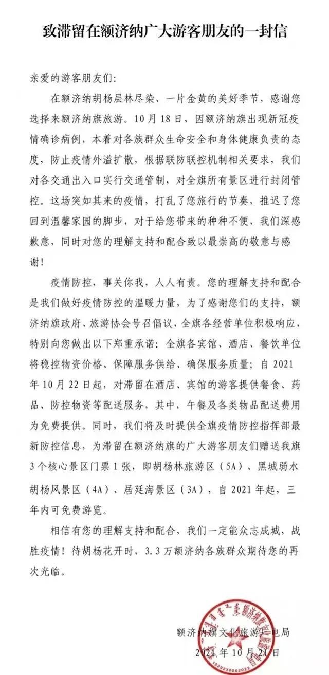 這封公開信中寫道,自10月22日起,對(duì)滯留在酒店、賓館的游客提供餐食、藥品、防控物資等配送服務(wù),其中,午餐及各類物品配送費(fèi)用為免費(fèi)提供;為滯留游客贈(zèng)送胡楊林旅游區(qū)(5A)、黑城弱水胡楊風(fēng)景區(qū)(4A)、居延海景區(qū)(3A)3個(gè)核心景區(qū)門票1張,自2021年起,三年內(nèi)可免費(fèi)游覽。