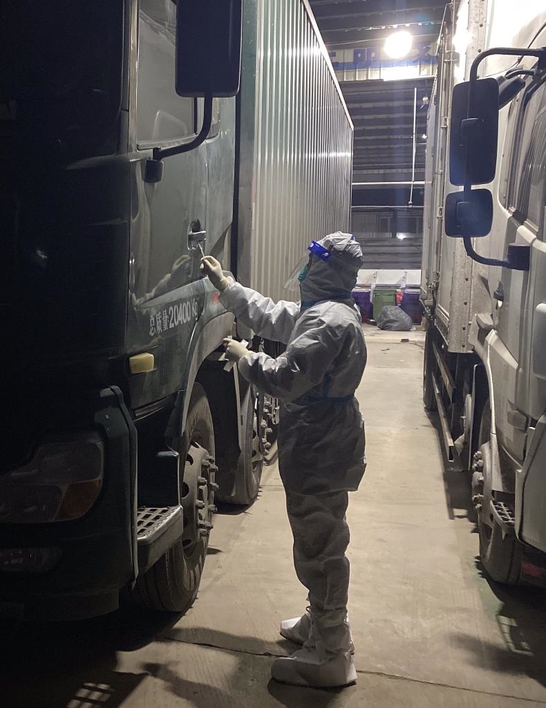 11月4日凌晨,工作人員對(duì)貨車(chē)把手采樣。(通遼市疾控中心供圖)