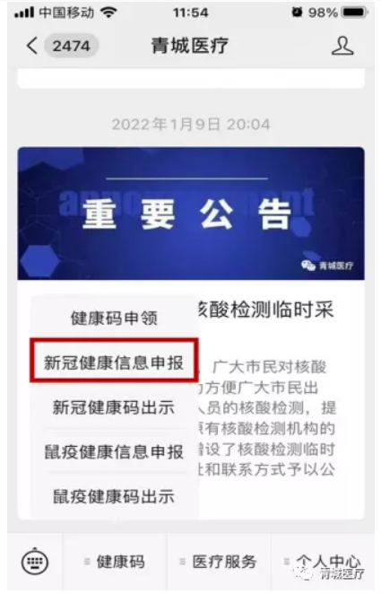 打開青城醫(yī)療微信公眾號,點擊“健康碼”選擇“新冠健康碼出示”。