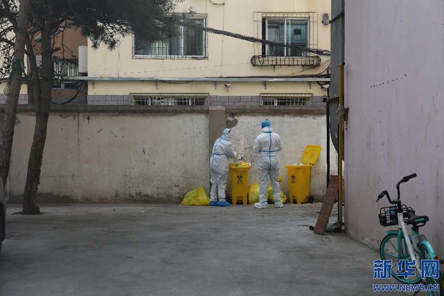 上午的樣本轉運工作告一段落,籍東斌和工作人員在指定地點脫掉防護服,進行全身消殺。新華網發(fā) 李倩攝