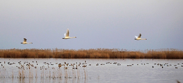 蘆葦蕩漾,鴻雁飛翔。此刻,鳥類攝影愛好者馬海明扛起他的相機(jī),駕著破冰艇駛向?yàn)趿核睾5纳钐?。他平靜地說(shuō):“再過(guò)些日子,這里的鳥更多、魚更歡,拍出來(lái)的照片會(huì)更美更精彩?!?/p>