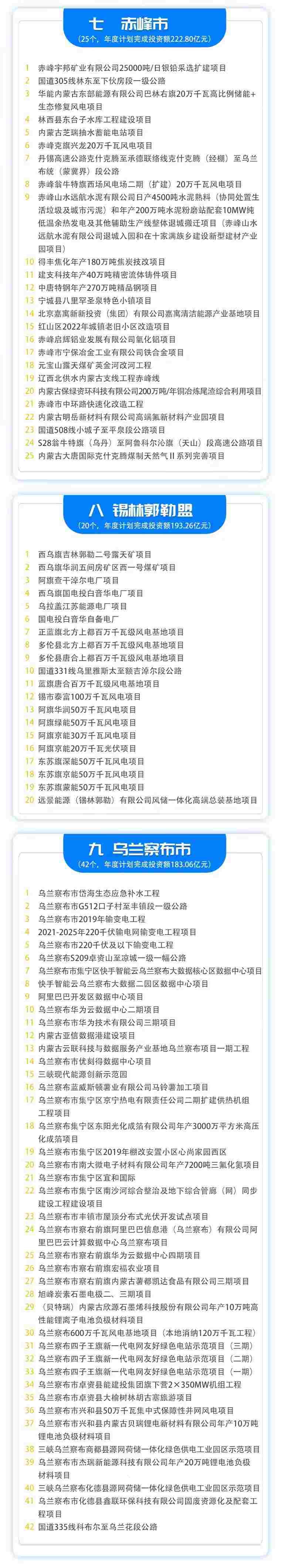 分盟市看,呼和浩特市計劃實施項目61個,包頭市60個,呼倫貝爾市15個,興安盟20個,通遼市23個,赤峰市25個,錫林郭勒盟20個,烏蘭察布市42個,鄂爾多斯市69個,巴彥淖爾市19個,烏海市20個,阿拉善盟21個。