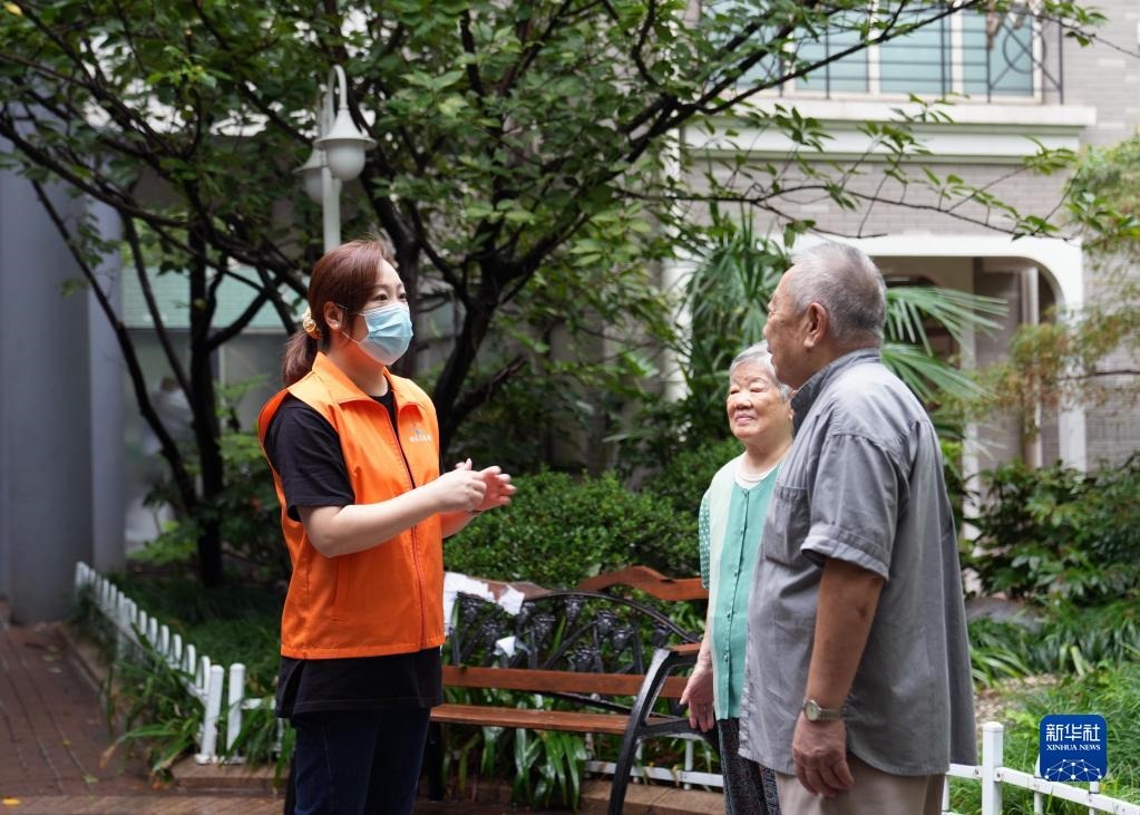在上海靜安區(qū)石門(mén)二路街道新福康里,居民區(qū)黨總支書(shū)記魏瑛(左)在和居民交流(2022年9月15日攝)。新華社記者 劉穎 攝