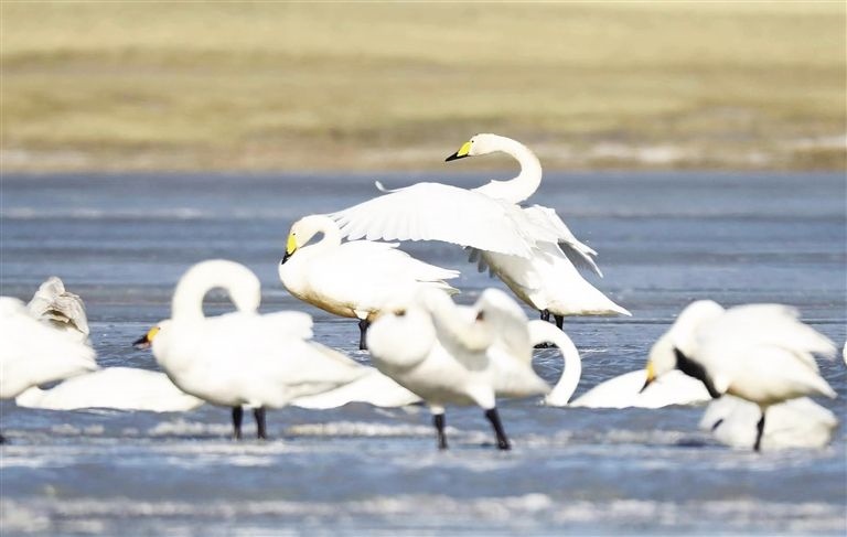晶晶和盈盈姐妹倆休憩在湖面上,多日的北歸之旅已讓它們疲憊不堪。晶晶說(shuō):“紅堿淖總給我一種家的感覺(jué)。”