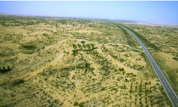 億利庫布其沙峰綠谷生態(tài)區(qū),由5600棵沙地柏種下的“綠色中國夢”五個(gè)大字耀眼醒目。