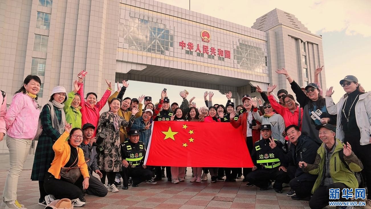 游客在滿洲里國門下合影。新華網發(fā) (李新軍 攝)