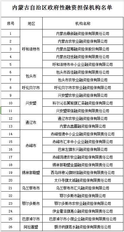 關(guān)于公布內(nèi)蒙古自治區(qū)政府性融資擔保機構(gòu)名單的通知
