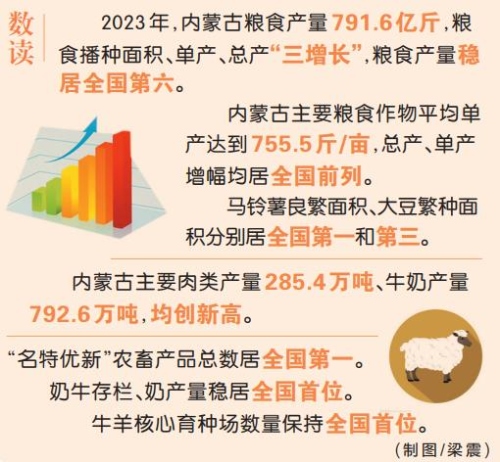 五谷者,萬民之命,國之重寶。2023年,內(nèi)蒙古以糧食產(chǎn)量791.6億斤迎來了第二十個(gè)豐收年。糧食播種面積、單產(chǎn)、總產(chǎn)“三增長”,糧食產(chǎn)量穩(wěn)居全國第六。全區(qū)主要肉類產(chǎn)量285.4萬噸、牛奶產(chǎn)量792.6萬噸,均創(chuàng)新高?!懊貎?yōu)新”農(nóng)畜產(chǎn)品總數(shù)居全國第一,“內(nèi)蒙古味道”香飄萬里。