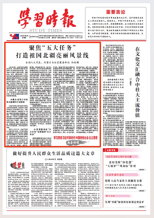 《學(xué)習(xí)時(shí)報(bào)》2024年3月6日第1版刊發(fā)全國(guó)人大代表、內(nèi)蒙古自治區(qū)黨委書記孫紹騁文章《聚焦“五大任務(wù)”打造祖國(guó)北疆亮麗風(fēng)景線》。