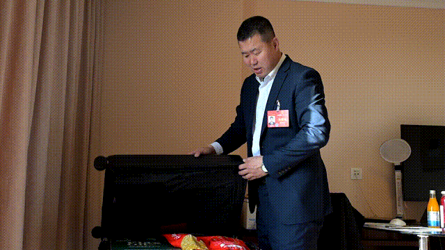 “這是我們?yōu)跆m察布市卓資縣的傳統(tǒng)名食卓資熏雞,這是我們自產(chǎn)的兩款亞麻籽油,它們都是我們當(dāng)?shù)赜刑厣霓r(nóng)畜產(chǎn)品,更是讓老百姓增收致富的產(chǎn)品。烏蘭察布有著豐富的資源,歡迎大家到烏蘭察布走一走、看一看?!毖χ君垷崆榈亟榻B起家鄉(xiāng)的特產(chǎn),并向全國人大代表發(fā)出邀請。