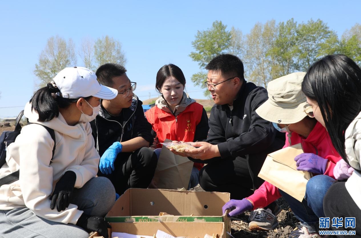 ??5月7日,在內(nèi)蒙古自治區(qū)扎蘭屯大豆科技小院,內(nèi)蒙古農(nóng)業(yè)大學(xué)研究生在大河灣鎮(zhèn)尖山子村試驗田播種大豆。新華網(wǎng)發(fā)(韓冷 攝)