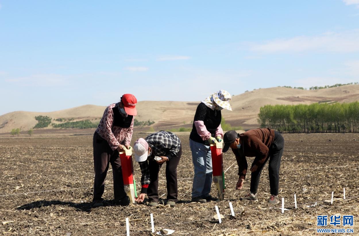 ?5月7日,在內(nèi)蒙古扎蘭屯大豆科技小院,農(nóng)民在大河灣鎮(zhèn)尖山子村試驗田手工播種大豆。新華網(wǎng)發(fā) (韓冷 攝)