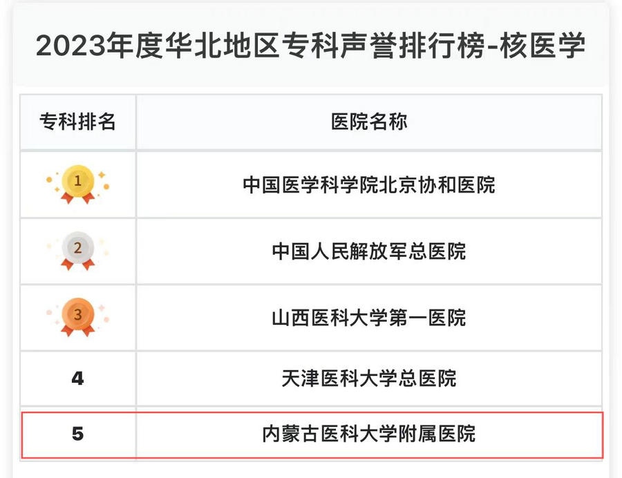 內(nèi)蒙古醫(yī)科大學(xué)附屬醫(yī)院核醫(yī)學(xué)科位列華北區(qū)第五,神經(jīng)外科、婦產(chǎn)科、風(fēng)濕科、重癥醫(yī)學(xué)、眼科、消化科、生殖醫(yī)學(xué)、腎臟病、皮膚科、內(nèi)分泌科、麻醉科、老年醫(yī)學(xué)、口腔科、檢驗(yàn)醫(yī)學(xué)、急診醫(yī)學(xué)、變態(tài)反應(yīng)、疼痛學(xué)、罕見病、耳鼻喉科、健康管理、血液科、整形外科等22個(gè)??偏@提名,是內(nèi)蒙古自治區(qū)在此榜單獲前五和提名??谱疃嗟尼t(yī)院。