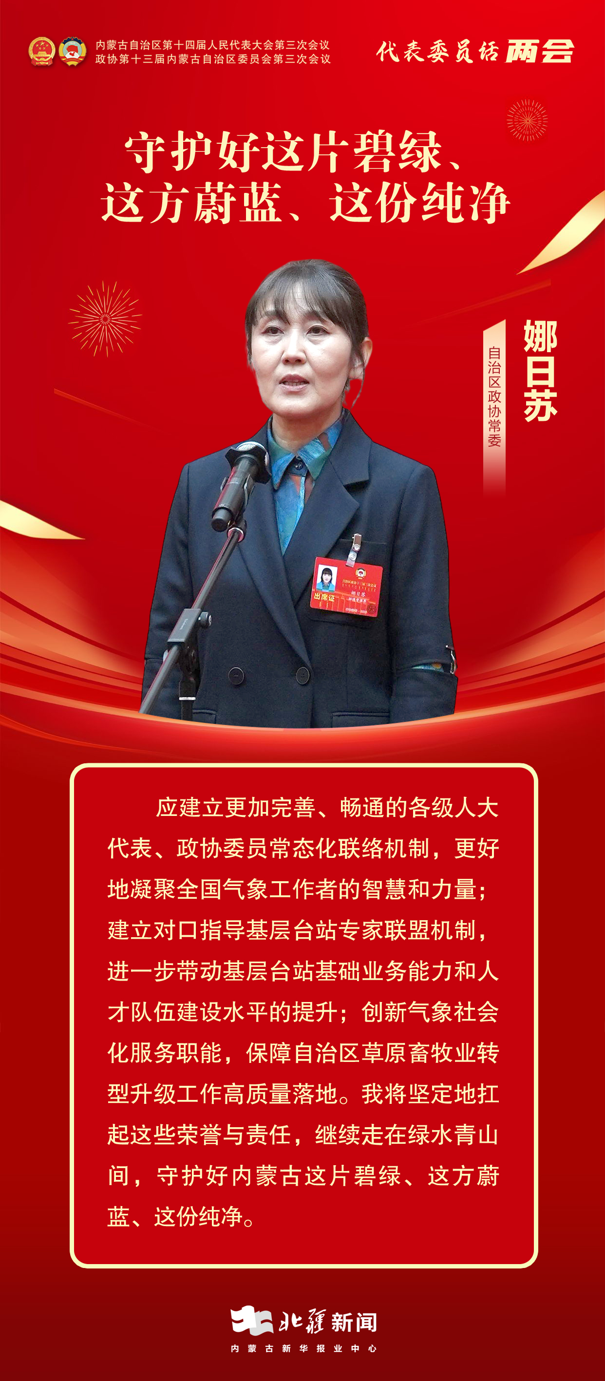 深耕生態(tài)氣象和牧業(yè)氣象服務(wù)多年,讓娜日蘇有了更加深入的思考,她建議:應(yīng)建立更加完善、暢通的各級人大代表、政協(xié)委員常態(tài)化聯(lián)絡(luò)機(jī)制,從而更好地凝聚全國氣象工作者的智慧和力量;建立對口指導(dǎo)基層臺站專家聯(lián)盟機(jī)制,進(jìn)一步帶動基層臺站基礎(chǔ)業(yè)務(wù)能力和人才隊(duì)伍建設(shè)水平的提升;創(chuàng)新氣象社會化服務(wù)職能,保障自治區(qū)草原畜牧業(yè)轉(zhuǎn)型升級工作高質(zhì)量落地。