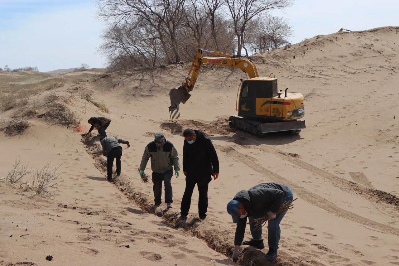 據(jù)錫林浩特市二蛋牧民養(yǎng)殖專業(yè)合作社負(fù)責(zé)人介紹,在傳統(tǒng)的沙漠治理作業(yè)中,工人需要手動栽植黃柳等固沙植物。然而,人工種植不僅效率低,勞動強度也大。為突破這一困境,合作社成員經(jīng)過多次試驗,最終決定對挖掘機進行創(chuàng)新改造,加裝叉具,這一巧妙的設(shè)計不僅實現(xiàn)了對黃柳種植深度和間距的精準(zhǔn)把控,還能有效避免土壤翻動,最大程度地保持了土壤水分,切實保護了沙地的生態(tài)環(huán)境?! ?/p>