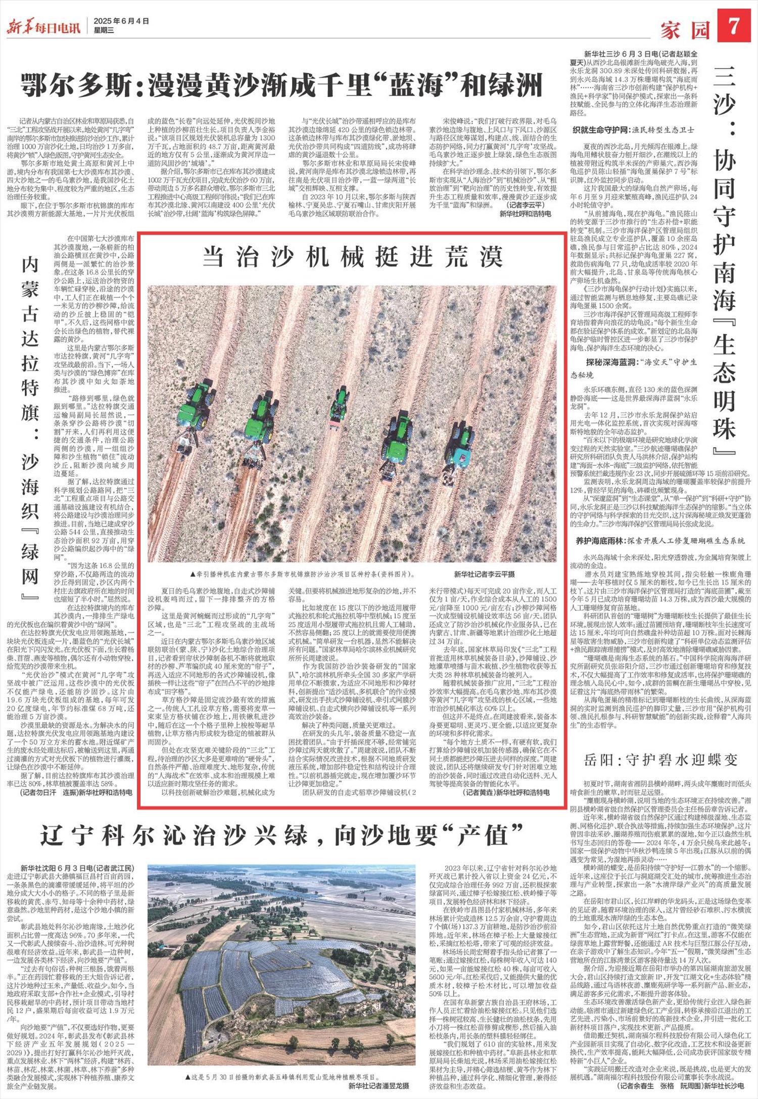2025年6月4日,《新華每日電訊》第7版刊發(fā)題為《當(dāng)治沙機(jī)械挺進(jìn)荒漠》一文,報道了內(nèi)蒙古鄂爾多斯毛烏素沙地區(qū)域聯(lián)防聯(lián)治(蒙、陜、寧)沙化土地綜合治理項(xiàng)目創(chuàng)新應(yīng)用系列機(jī)械化沙障鋪設(shè)裝備,適應(yīng)復(fù)雜地形,“三北”工程治沙效率大幅提高。毛烏素沙地、庫布其沙漠等黃河“幾字彎”攻堅(jiān)戰(zhàn)的核心區(qū)域,一些地市治沙機(jī)械化率達(dá)60%以上。