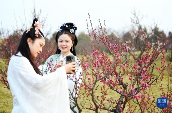 2月25日,古風(fēng)愛好者在長安唐村梅園內(nèi)拍攝視頻。