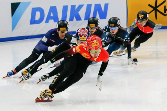 3月11日,中國(guó)選手臧一澤(左一)在比賽中。新華社記者王益亮攝