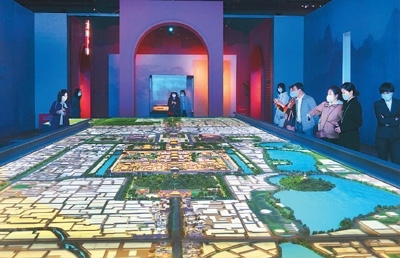 走進(jìn)“壯美中軸”展區(qū),一個(gè)16米長的沙盤將北京中軸線沿線建筑全貌清晰呈現(xiàn)在眼前,帶給人強(qiáng)烈的視覺震撼。北起鐘鼓樓,南至永定門,北京中軸線全長約7.8公里,是世界上現(xiàn)存最長的城市中軸線。沙盤上的立體投影模擬出晝夜交替、四季輪轉(zhuǎn)的景象,讓人仿佛穿越時(shí)空,感受中軸線的歷史演變。沙盤兩側(cè)的電子屏滾動(dòng)播放著三維動(dòng)畫,立體展現(xiàn)故宮、天壇、景山等中軸線重要遺產(chǎn)點(diǎn)。