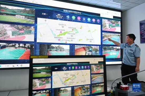 4月24日,西河智慧體育公園工作人員在介紹智慧體育綜合管控平臺(tái)。該平臺(tái)可對(duì)公園內(nèi)的人流、安全、環(huán)境以及公園周邊“15分鐘健身圈”運(yùn)動(dòng)場(chǎng)地的門禁、燈光等設(shè)備實(shí)現(xiàn)智能化管理。