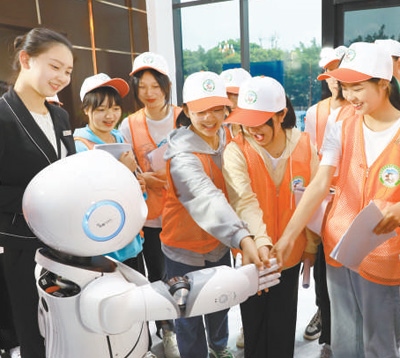 “數(shù)游峨眉”體驗(yàn)中心,參加研學(xué)的學(xué)生與智能講解機(jī)器人互動(dòng)。 峨眉山市融媒體中心供圖